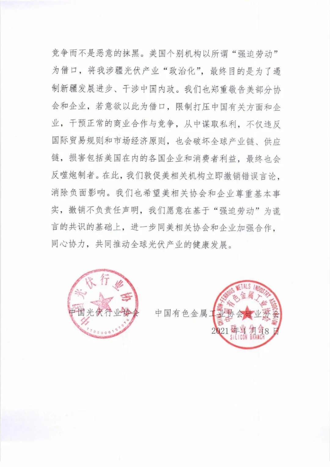 In response to this situation, the China Photovoltaic Industry Association and the Silicon Branch of China Nonferrous Metals Industry Association issued a joint statement on January 18 to strongly respond to the untrue remarks of the United States.