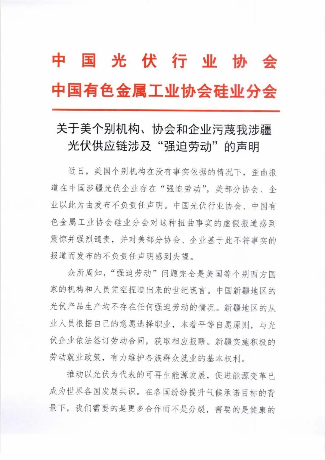 Recently, some US agencies misrepresented forced labor in photovoltaic enterprises in Xinjiang, China without any factual basis. Some US associations and enterprises issued irresponsible statements on this basis. The China Photovoltaic Industry Association and the Silicon Branch of China Nonferrous Metals Industry Association are shocked and strongly condemn such false and distorted reports, and are disappointed by the irresponsible statements issued by some US associations and enterprises based on such untrue reports.